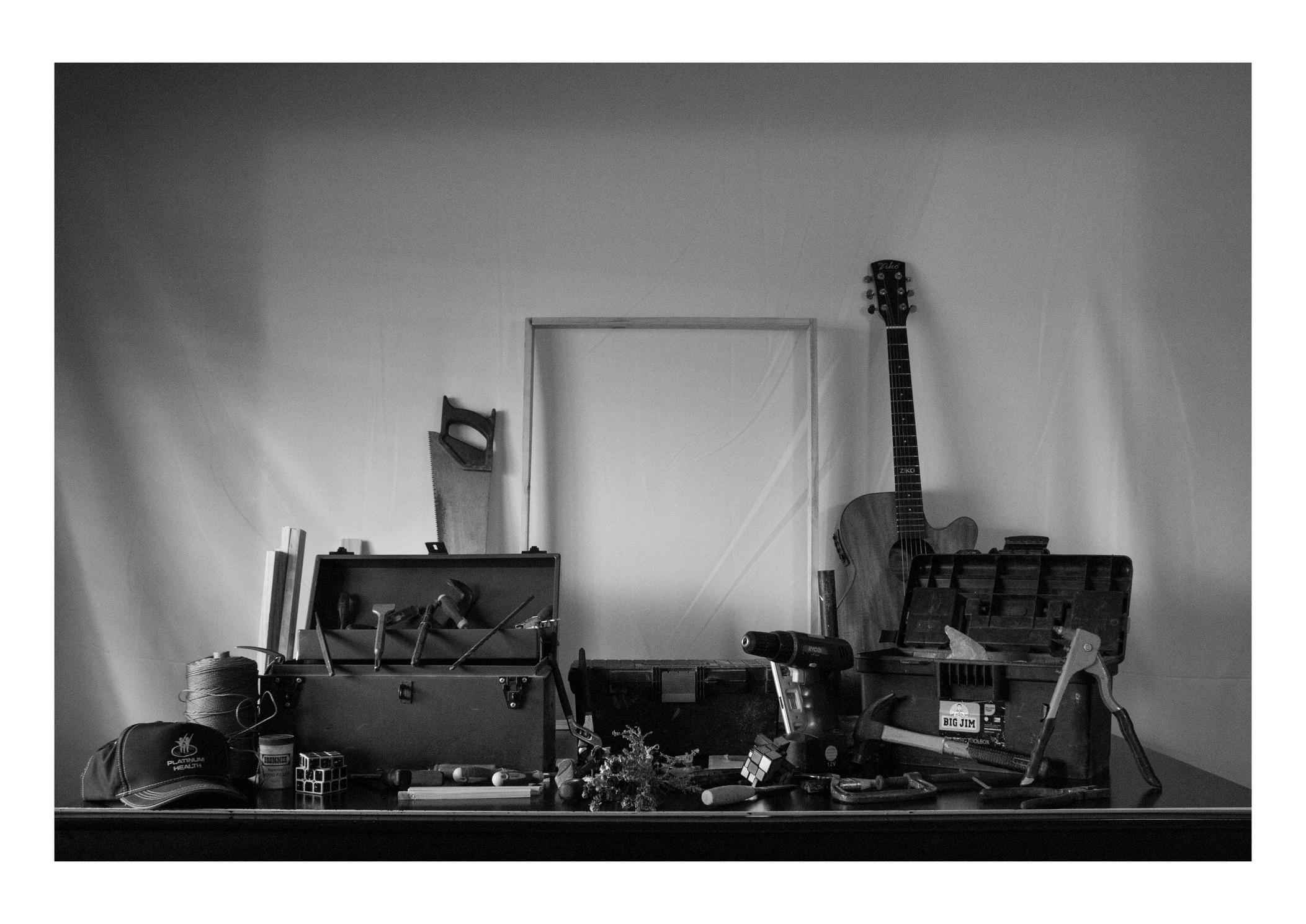 Forme,toolsaremorethanjustphysicalobjectsthatmy fatherandgrandfatherused;Theyserveasrelicsofthe inheritedunderstandingofwhatitmeansto"beaman,"a legacypasseddowntome.Thisvisualapproachstemsfrom mystruggletoembracemyfather'sversionofmasculinity fullyandnotbeingabletowieldthesetoolsproficiently.
