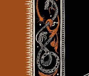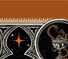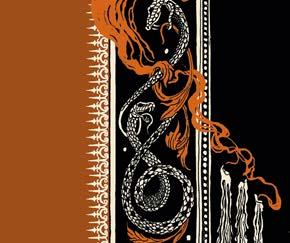 Quando o homem andou com passos leves de um aposento para o seguinte, seus passos deslocaram poeira, seu olhar caiu em teias e nas novas redes de aranhas, que pendiam em algumas das muitas passagens. Muitos objetos curiosos e lindos ocupavam esses aposentos vazios: entalhes cheios de prata enegrecida, pinturas de temas sagrados, móveis cobertos de tapeçarias com tons ricos, outras peças de tapeçaria nas paredes e, em um quarto, enfeites de seda roxa bordados com cabelos de donzelas em tons de castanho e dourado. Um aposento era cheio de livros empilhados no chão, e no meio deles havia uma mesa com cálices estranhos de conchas posicionados sobre prata e electro1. Depois de passar por essas coisas sem nem olhar, o jovem subiu para o andar de cima e destrancou uma porta cujo trinco enferrujado precisou de toda a força dele para ser virado. Foi em um depósito e entrou – era iluminado por janelas longas e baixas com vista para a rua, que eram cuidadosamente protegidas por linho; a sala estava lotada de poeira e com um cheiro horrível de mofo. No chão havia fardos de coisas, escarlate, azul e verde, azulejos pintados, lampiões velhos, roupas, trajes de padre lindamente trabalhados, copos e pequenas arcas enferrujadas. Na frente de uma dessas portas, o jovem ficou de joelhos e a destrancou. Continha uma quantidade de pedaços de vidro cortados representando pedras preciosas. Ele selecionou dois de tamanho igual e cor verde límpida, e, com a mesma gravidade e silêncio com que tinha chegado, voltou para a oficina. Quando viu o diabo, parcialmente reluzente em ouro e em madeira exposta, ele franziu a testa e colocou o vidro verde nas órbitas ocas da coisa. Com o efeito cintilante de luz e vida produzidos por isso, a testa relaxou; ele ficou por um tempo contemplando seu trabalho, lavou os pincéis e guardou as tintas e a folha de ouro. Agora, o sol tinha mudado e estava brilhando na sala, lançando sombras quentes