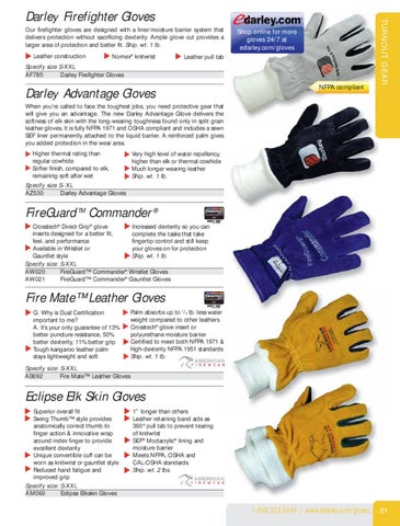 FireGuard TM Commander ® Crosstech® Direct Grip® glove Increased dexterity so you can inserts designed for a better fit, complete the tasks that take feel, and performance fingertip control and still keep Available in Wristlet or your gloves on for protection Gauntlet style Ship. wt. 1 lb. Specify size: S-XXL AW020 FireGuard™ Commander® Wristlet Gloves AW021 FireGuard™ Commander® Gauntlet Gloves