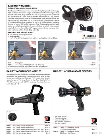SABERJET™ DUAL SHUTOFF NOZZLE • The first truly multi-purpose nozzle • Sizes Available: • 3/4", 7/8" and 1" orifices with 11/2" or 21/2" inlet, Fog Flow 135 at 100 psi FOG