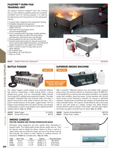 SMOKE CANDLES FOR FIRE TRAINING AND TESTING SEWER/WATER MAINS Eliminates costly equipment and time wasted when attempting to pinpoint leaks. This highly-visible smoke blends readily with air. They can also be used to trigger fire alarms, observe air flow or used as a signal. Other uses are to test fire masks, and use in Fire Service Training and exercises. No residue to stain clothing or building interiors; no explosives. H166A has a double wick. Ship. wt. 4 lbs. Cat# L409 H165 H166A