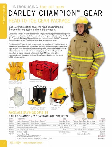 DESCRIPTION SIZE COLOR Darley Champion™ Gear Coat - Nomex® See Size Chart Yellow, Black, Tan, Red or Navy Darley Champion™ Gear Pants - Nomex® See Size Chart Yellow, Black, Tan, Red or Navy Hellfire™ Structural Felt-Lined Firefighting Boots Size: 7-14, 15 Width: M, W, XW Black Darley Gold Gauntlet Gloves S-XL, Jumbo Gold Fire-Dex® 911™ Helmet N/A Red, Black, Yellow or White Nomex® Hood One Size Fits All White Jumbo Gear Bag N/A Red with Black Trim GEAR PURCHASED SEPARATELY HEAD-TO-TOE GEAR PACKAGE SPECIAL PRICE