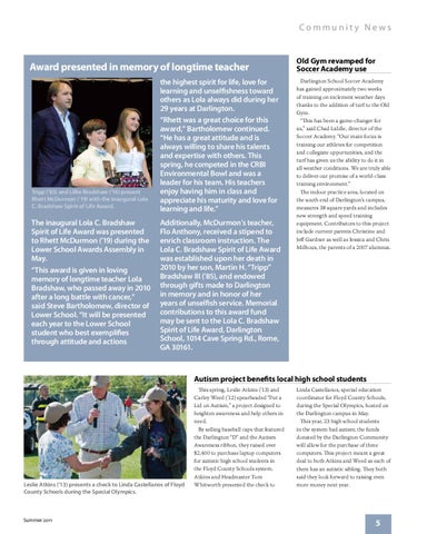 the highest spirit for life, love for learning and unselfishness toward others as Lola always did during her 29 years at Darlington. “Rhett was a great choice for this award,” Bartholomew continued. “He has a great attitude and is always willing to share his talents and expertise with others. This spring, he competed in the CRBI Environmental Bowl and was a leader for his team. His teachers enjoy having him in class and appreciate his maturity and love for learning and life.” Additionally, McDurmon’s teacher, Flo Anthony, received a stipend to enrich classroom instruction. The Lola C. Bradshaw Spirit of Life Award was established upon her death in 2010 by her son, Martin H. “Tripp” Bradshaw III (’85), and endowed through gifts made to Darlington in memory and in honor of her years of unselfish service. Memorial contributions to this award fund may be sent to the Lola C. Bradshaw Spirit of Life Award, Darlington School, 1014 Cave Spring Rd., Rome, GA 30161.