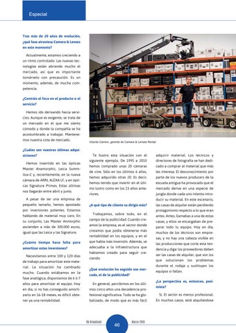Tras más de 20 años de evolución, ¿qué fase atraviesa Camera & Lenses en este momento? Actualmente, estamos creciendo a un ritmo controlado. Las nuevas tecnologías están abriendo mucho el mercado, así que es importante tomárselo con precaución. Es un momento, además, de mucha competencia. ¿Centráis el foco en el producto o el servicio? Hemos ido derivando hacia servicios. Aunque es exigente, se trata de un mercado en el que me siento cómodo y donde la compañía se ha acostumbrado a trabajar. Mantenemos nuestra cota de mercado.