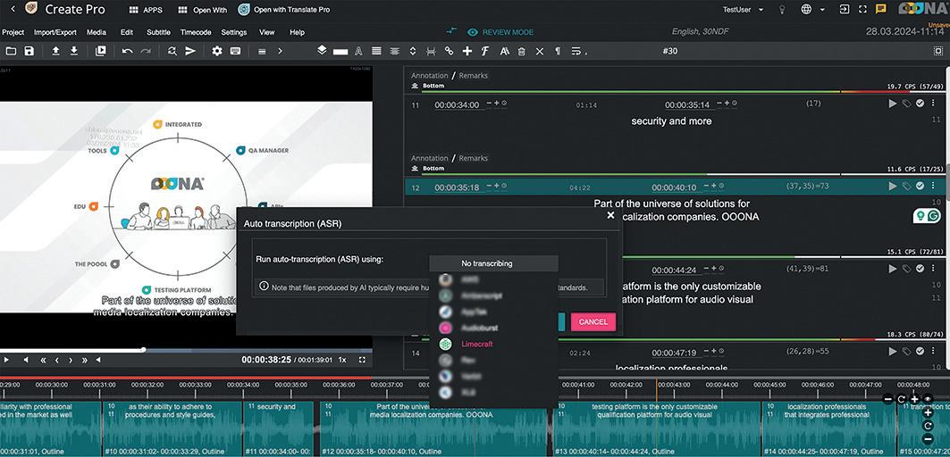 “When we initially engaged with OOONA, we were on the verge of achieving a remarkable 2% error rate in dialogue accuracy,” remarks Maarten Verwaest, Limecraft’s co-founder. “Since then, we have surpassed that milestone, offering industryleading levels of accuracy and, consequently, efficiency. We are delighted that our solution is being integrated into the OOONA