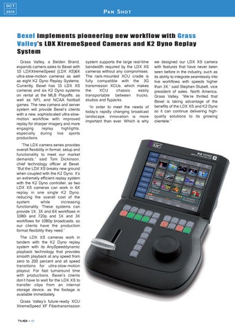 Bexel implements pioneering new workflow with Grass Valley’s LDX XtremeSpeed Cameras and K2 Dyno Replay System Grass Valley, a Belden Brand, expands camera sales to Bexel with 10 LDXXtremeSpeed (LDX XS)6X ultra-slow-motion cameras as well as eight K2 Dyno Replay Systems. Currently, Bexel has 15 LDX XS cameras and six K2 Dyno systems on rental at the MLB Playoffs, as well as NFL and NCAA football games. The new camera and server system will provide Bexel’s clients with a new, sophisticated ultra-slowmotion workflow with improved replay for sharper imagery and more engaging replay highlights, especially during live sports productions. “The LDX camera series provides overall flexibility in format, setup and functionality to meet our market demands,” said Tom Dickinson, chief technology officer at Bexel. “But the LDX XS breaks new ground when coupled with the K2 Dyno. It’s an extremely efficient replay system with the K2 Dyno controller, as two LDX XS cameras can work in 6X replay in one single K2 Dyno, reducing the overall cost of the system while increasing functionality. These systems can provide 1X, 3X and 6X workflows in 1080i and 720p and 1X and 3X workflows for 1080p broadcasts, so our clients have the production format flexibility they need.” The LDX XS cameras work in tandem with the K2 Dyno replay system with its AnySpeeddynamic playback technology that provides smooth playback at any speed from zero to 200 percent and all speed transitions for ultra-slow-motion playout. For fast turnaround time with productions, Bexel’s clients don’t have to wait for the LDX XS to transfer clips from an internal storage device, as the footage is available immediately. Grass Valley’s future-ready XCU XtremeSpeed XF Fibertransmission
