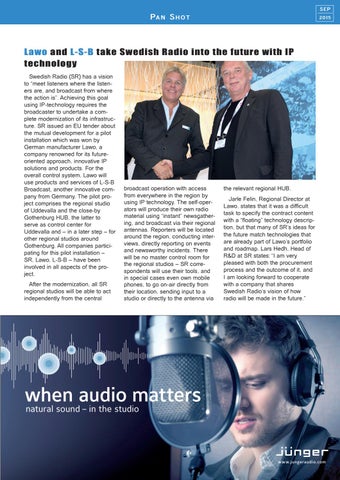 Lawo and L-S-B take Swedish Radio into the future with IP technology Swedish Radio (SR) has a vision to “meet listeners where the listeners are, and broadcast from where the action is”. Achieving this goal using IP-technology requires the broadcaster to undertake a complete modernization of its infrastructure. SR issued an EU tender about the mutual development for a pilot installation which was won by German manufacturer Lawo, a company renowned for its futureoriented approach, innovative IP solutions and products. For the overall control system, Lawo will use products and services of L-S-B Broadcast, another innovative company from Germany. The pilot project comprises the regional studio of Uddevalla and the close-by Gothenburg HUB, the latter to serve as control center for Uddevalla and – in a later step – for other regional studios around Gothenburg. All companies participating for this pilot installation – SR, Lawo, L-S-B – have been involved in all aspects of the project. After the modernization, all SR regional studios will be able to act independently from the central