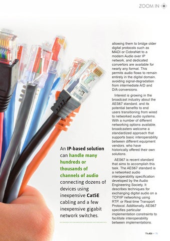 Interest is growing in the broadcast industry about the AES67 standard, and its potential benefits to end users transitioning from wired to networked audio systems. With a number of different networking options available, broadcasters welcome a standardized approach that supports basic interoperability between different equipment vendors, who have historically offered their own solutions. AES67 is recent standard that aims to accomplish this task. The AES67 standard is a networked audio interoperability specification developed by the Audio Engineering Society. It describes techniques for exchanging digital audio on a TCP/IP networking using RTP, or Real-time Transport Protocol. Additionally, AES67 specifies particular implementation constraints to facilitate interoperability between implementations. TMBi - 71