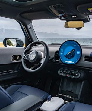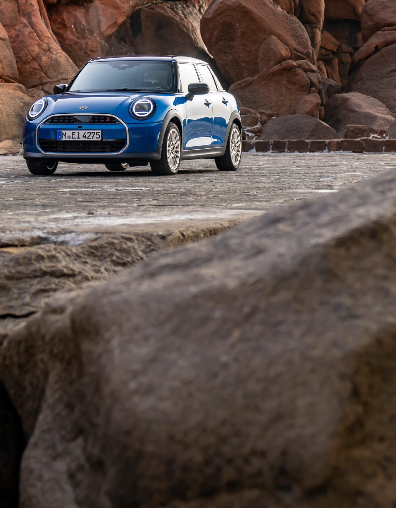 A new octagonal grille conceals 12 ultrasonic sensors, and the smoked round LED headlights now each house dual horizontal daytime running light elements, while the rears take on a trapezoidal shape. Both lamps feature customizable signatures and approach/depart animations. Bundle the JCW Performance Package (+ $4,000) and