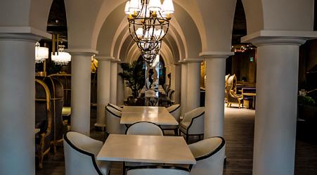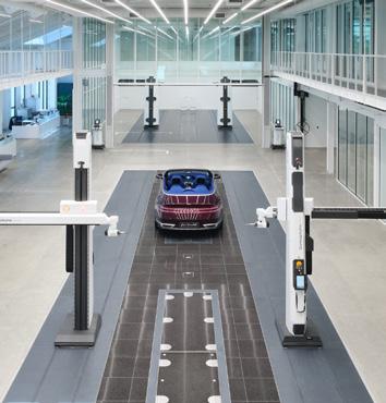 glass-roof atrium in the center, where vehicles can be staged atop two turntables built directly into the brick flooring, the expansive open-air space serves as a gathering spot as well, such as for our group of visiting media and industry executives before a guided tour.