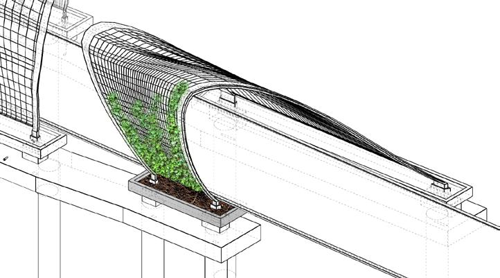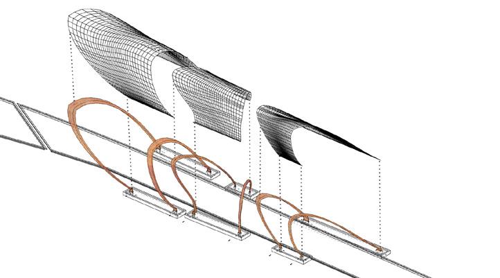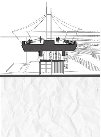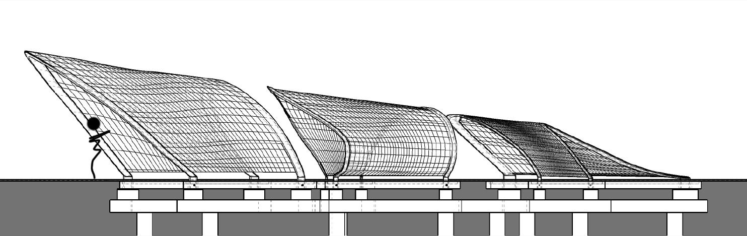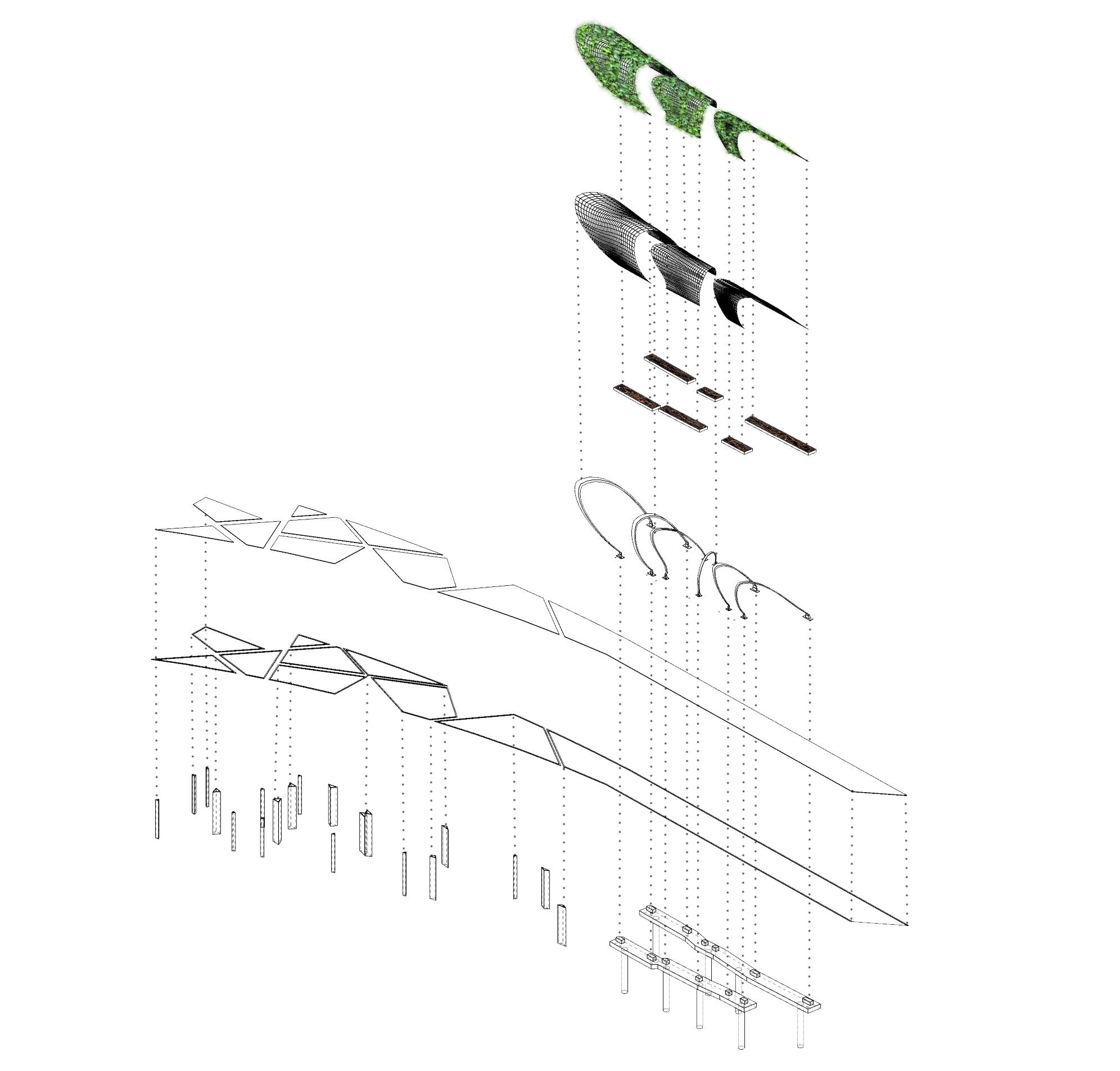 A steel frame system inspired by the topography of the site is implemented to expedite the construction. Prefabricated steel mesh is draped over the primary structure to allow bracing for a potential complex structural arrangement to be realized efficiently. Deep pile driven foundation is used to counter the weight and marsh terrain.