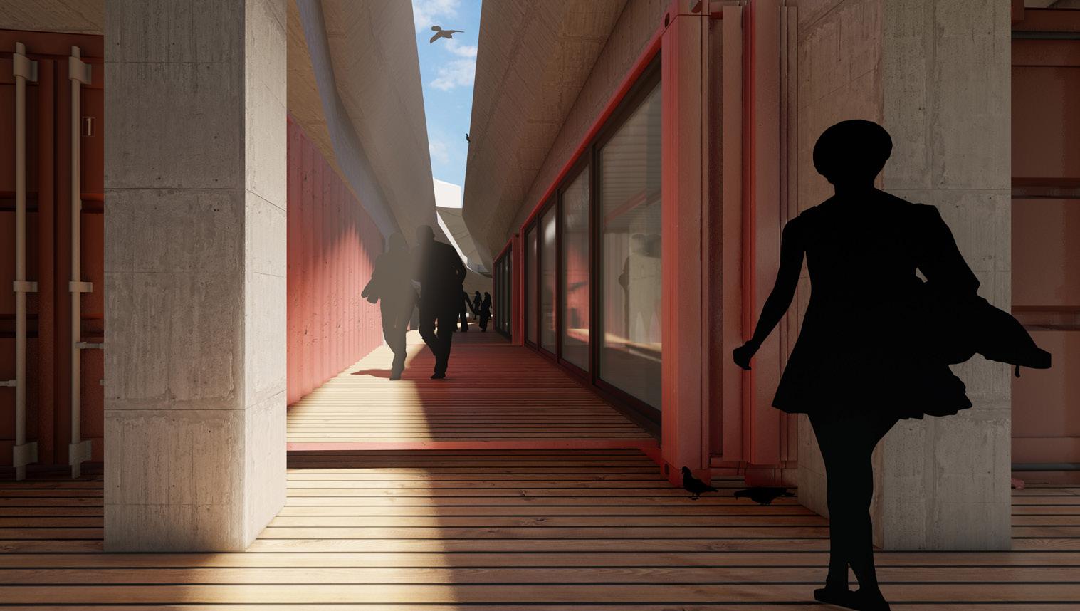 Located between a large residential area and Newcastle city center. A walkway currently exists but is not used as it ends abruptly at a neglected building. This new addition would create a social shortcut into the city while inhabiting the bridge with small startup businesses, growing a sense of community.