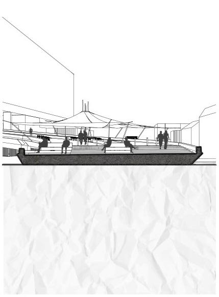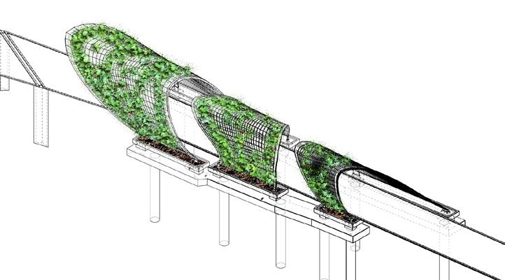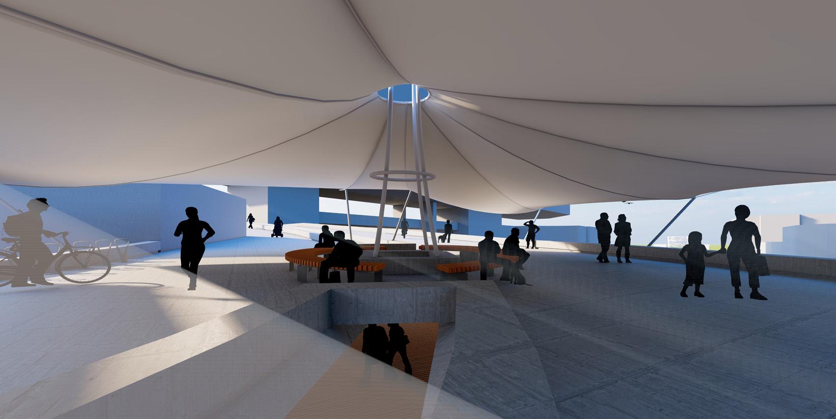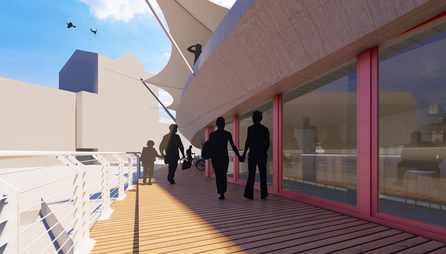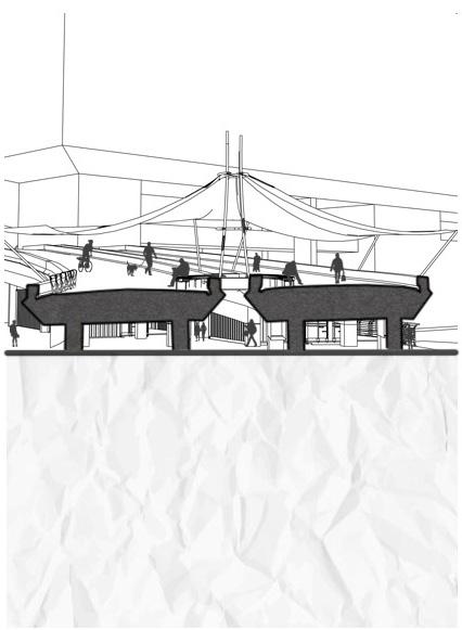 The Social Shortcut provides a primary function of linking a heavily populated residential area to the urban city center. The existing bridge is clearly visible on the far left but leads to nowhere hence it is never utilized. The new addition provides that link and with the increased foot traffic, tactically positioned social spaces have been added. Two social spaces are provided, the first is at the top of the bridge and will provide scenic views of the city and potential gentrification of the site below. The second social space is provided at the entrance nearer the city. This will heighten the curb appeal and provide protection from the elements. The bridge has a lot of space below that is inhabited by local startup companies. These pods are located under the cover of the tensile cover or the bridges’ structure itself.