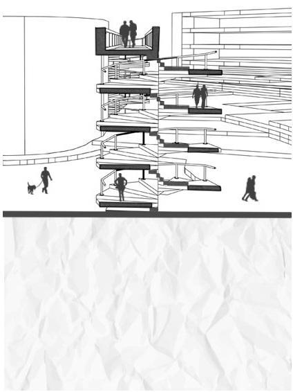 The site is a derelict construction site with a large height discrepancy. The site exists as a dilapidated unsafe ecology on the fringe of the city. Intervention provides an alternate path for the visitors. Allowing unconfined aerial view of the city for the visitors, while creating a safe connection for residents.