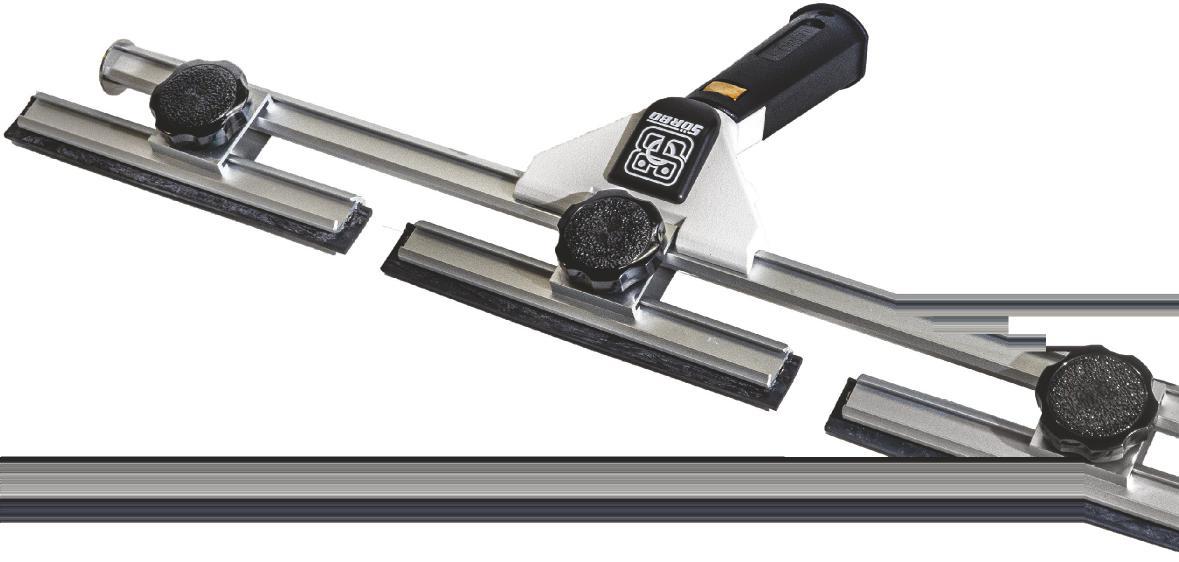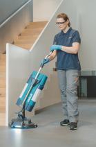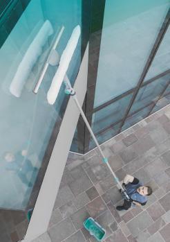 The washer is lightweight and has small cavities in the cross strut that act as mini water reservoirs, supplying cleaning water to the cleaning textile. The non-slip handle on the window squeegee ensures cleaning staff can keep a firm grip. The kit also contains two washer covers, a glass scraper, a telescopic lance, a pack of microfibre cloths and an adapter for the Lampo quickchange system.
