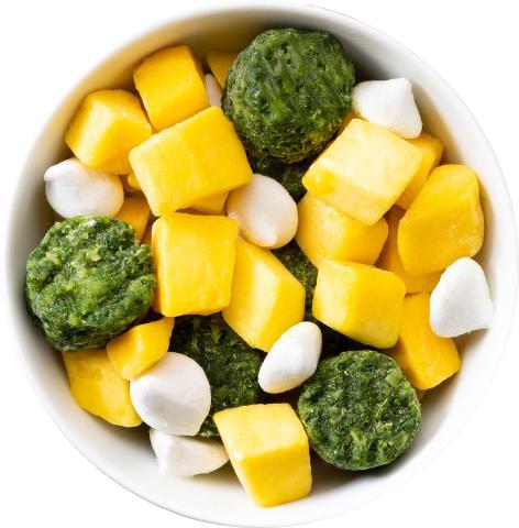 carottes en cubes, petits pos m -fins, harcots verts coupés fèves de maras, maïs