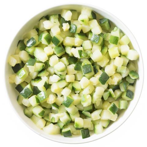 tomates em cubos, berngelas, curgete em cuartos, cebola em cubos, pimento verde em cubos, pimento vermelho em cubos