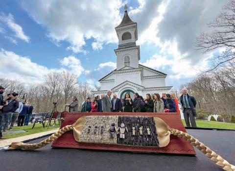 Following the repatriation of Samson Occom’s papers to the Mohegan Tribe, members of the tribe and a delegation from Dartmouth gathered outside the Mohegan Church in Uncasville, Connecticut. In the foreground is the Wampum belt that the Mohegan Tribe presented to Dartmouth as a reaffirmation of their relationship.