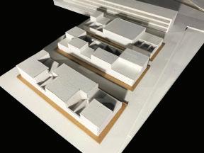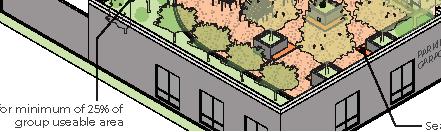 The proposed building has gable roofs. Expressing a residential character along Stanwood Drive and Dellwood Way, mirroring the roof forms of the residential neighbors across the street. In contrast, but also taking into consideration the flat roofs of the neighboring markets along the west. The third floor has a large courtyard with a Youth Center structure that spills out to outdoor play structures and community vegetable garden area with raised planters.