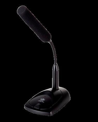 A push button with LED indicator lets the user activate or deactivate the microphone locally. The desktop base incorporates a pre-amplifier powered by two AAA batteries (3 Vdc) in case it cannot be connected to Phantom power.