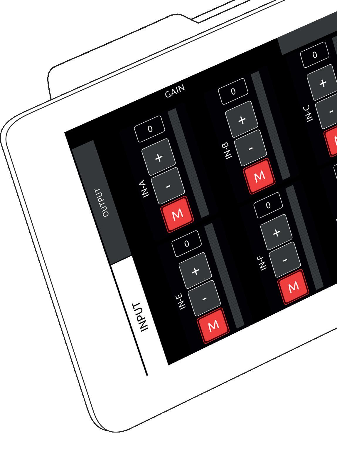 GRAL-MA1604 products. The touch screen panel provides quick access to input and output channels, preset recall, and meter monitoring which allows the user to mute channels or adjust input/output gains.