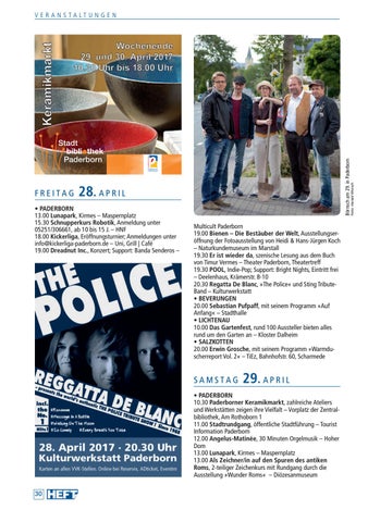 Multicult Paderborn 19.00 Bienen – Die Bestäuber der Welt, Ausstellungseröffnung der Fotoausstellung von Heidi & Hans-Jürgen Koch – Naturkundemuseum im Marstall 19.30 Er ist wieder da, szenische Lesung aus dem Buch von Timur Vermes – Theater Paderborn, Theatertreff 19.30 POOL, Indie-Pop; Support: Bright Nights, Eintritt frei – Deelenhaus, Krämerstr. 8-10 20.30 Regatta De Blanc, »The Police« und Sting TributeBand – Kulturwerkstatt • BEVERUNGEN 20.00 Sebastian Pufpaff, mit seinem Programm »Auf Anfang« – Stadthalle • LICHTENAU 10.00 Das Gartenfest, rund 100 Aussteller bieten alles rund um den Garten an – Kloster Dalheim • SALZKOTTEN 20.00 Erwin Grosche, mit seinem Programm »Warmduscherreport Vol. 2« – TiEz, Bahnhofstr. 60, Scharmede