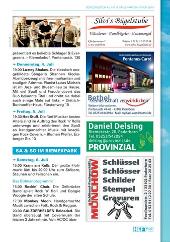 SA & SO IM RIEMEKPARK Samstag, 6. Juli 15.00 Kram am Kolk. Der große Flohmarkt lädt bis 20.00 Uhr zum Stöbern, Staunen und Feilschen ein. Das Bühnenprogramm: 15.00 Rockin‘ Chair. Die Delbrücker Band spielt Rock ’n’ Roll und Boogie Woogie der alten Schule. 17.30 Monkey Moon. Handgemachte Musik zwischen Folk, Rock & Reggae. 20.00 SALZDERHELDEN Reloaded. Die Band überzeugt mit Covermusik der letzten 3 Jahrzehnte. Von AC/DC über 29