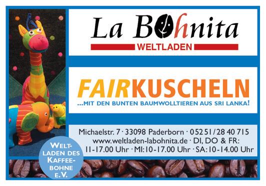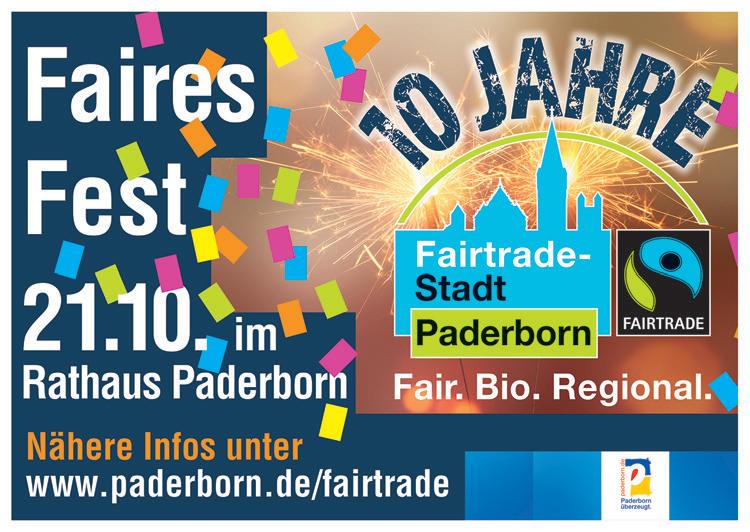 21. Oktober, 18 Uhr, Paderborn, Rathaus Bereits 2012 wurde die Stadt Paderborn zur 100. Deut schen Fairtrade-Stadt erklärt. Zum 10-jährigen Jubiläum lädt die Steuerungsgruppe Faires Paderborn gemeinsam mit der Stadt Paderborn am Freitag, den 21.10.2022 um 18 Uhr, zum Fairen Fest in das Rathaus ein.