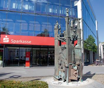 Als die Sparkasse Paderborn Ende 1984 das runde Geschäftsvolumen von 2 Mil liarden DM erreicht hatte, da beschloss der Verwaltungsrat, der Stadt und ihren Bürgern einen Brunnen zu stiften. Aus schreibung, Bewertung, Preisvergabe und Modeländerungen haben – bis hin zum Fertigungsauftrag an den ersten Preisträger, Bildhauer Werner Klenk –geraume Zeit in Anspruch genommen. Seit 1989 aber steht der Paderborner Sagenturm vor dem Eingang der Haupt stelle der Sparkasse Paderborn-Detmold an der Kreuzung Hathumarstraße/Müh lenstraße.