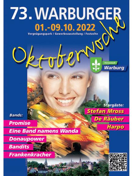 Zur Oktoberwoche vom 1. bis 9.10. ist ganz Warburg auf den Beinen. Fast alle Bürgerinnen und Bürger der Hansestadt identifizieren sich mit dem Fest, nehmen in irgendeiner Form Teil an Vorbereitungen und Aktivitä ten: An den Schulen finden Wettbewerbe statt, Sport vereine führen Turniere durch, verschiedenste Gruppen und Vereine nehmen an drei Umzügen teil. Jugend und jung Gebliebene feiern gemeinsam im großen Fest zelt. Ausgelassene Party-Stimmung ist durch namhafte Bands garantiert: Gefreut werden darf sich auf: »Do naupower«, »Bandits«, »Eine Band namens Wanda«, »Frankenkracher« und »Promise«. »De Räuber« rocken mit kölscher Mundart die Bühne, Stefan Mross und Anna Carina Woitschack lassen Schlager-Herzen höher schlagen und Harpo bringt den unsterblichen Moviestar mit nach Warburg – und das alles bei freiem Eintritt. Auf dem Rummel geht`s ebenfalls rund: Autoscooter, Musikexpress, Break-Dancer und Racing-Coaster locken mit rasanten Loopings und berauschender Geschwin