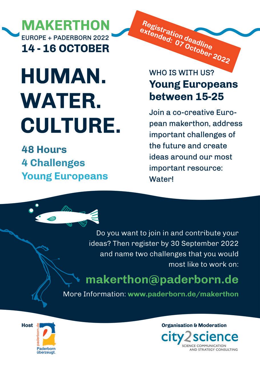 Mit dem Titel »Stadt. Mensch. Fluss. Die Pader für Euro pa« erarbeitet die Stadt Paderborn derzeit eine Bewer bung für das Europäische Kulturerbe-Siegel. In diesem Zusammenhang lädt die Stadt Paderborn in Koopera tion mit der city2science GmbH junge Menschen ab 15 Jahren zu einem europäischen Makerthon zum Thema HUMAN.WATER.CULTURE ein. Vom 14. bis 16. Oktober 2022 können alle Interessierten kreativ werden und von Freitagabend bis Sonntagmittag spannende Projekte entwickeln, die im Rahmen der Bewerbung für das Eu ropäische Kulturerbe-Siegel eine zentrale Rolle spielen werden.