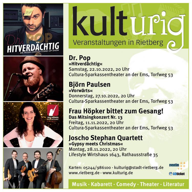 Der Frauenchor »Ton in Ton« sucht neue, begeis terte Chorsängerinnen. Wir bestehen seit nunmehr acht Jahren und singen einen bunten Mix aus aktuellen Popsongs, Oldies, Gospel und Spirituals. Dabei steht vor allem der Spaß am Singen im Vordergrund, mit gelegentlichen Auftritten. Wenn wir Dein Interesse geweckt haben, freuen wir uns, wenn Du zur Probe dienstags um 19.00 Uhr ins Laurentiusheim, Schulstr. 3, Paderborn, vorbeikommst. Kontakt: janakupke@gmx.net (gew.) Biografie-Arbeit Jahresgruppe. Das Leben verstehen wollen. Gemeinsam Erlebnisse lesen lernen. Dynamisches Tierkreiszeichnen, Erarbeiten der 12 Zeichen. 1 x monatlich samstags von 10.30-16.30 Uhr über 1 Jahr. Beginn: 29.10.2022. Information und An meldung: g.schachten@posteo.de, Tel. 01575/1189829 Weiblich, Jahrgang 1964, sucht ... Ich bin weiblich, Jahrgang 1964, komme aus PB und suche Mitspieler für Triominos, Spaziergänger:innen, die auch vormittags Zeit haben, Federballspieler:innen zum Spielen tagsüber in der Wiese. Es können sich auch Katzen-/Strickfreunde melden. charly.paule@gmx.de Kluge und schöne Lady ... sucht prickelnde, erotische Liaison – wohltuend für Geist u. Seele (... mehr als eine Affäre). Bin 62 J., 168, blond, apart, feminin. Voller Esprit, Humor u. Tiefe und lebe frei u. ungebun den. Bitte Mail mit Foto von charmanter Männerseele mit Charakter (ca. 40-63 J.) an: mail.an.belinda@gmail.com Ska Band Gründung. Wir, Saxofonistin, Sängerin, Bassist (Alter 30+ bis 50+), gründen eine neue Ska Band in Pader born und suchen Musiker:innen. Keyboard, Drums, Gitarre, gerne weitere Bläser. Proberaum vor handen. Probe montagabends. Bandgrueundung@paderborn. com