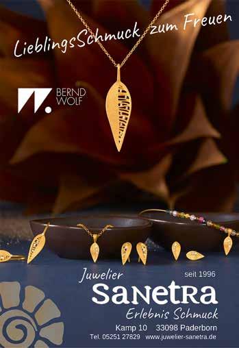 bis 4.12. Zurück in die Zukunft – Honigbienen im Wald, Sonderausstellung mit Bildern des Tier- und Natur fotografen Ingo Arndt sowie Texten des Bienenforschers Jürgen Tautz – Naturkundemuseum bis 17.12. Birgit Brade: Wallflowers and all that Jazz, Malerei und Monotypie – Mühlencafé, Spitalmauer 27c bis 5.1. Kinder brauchen Eltern, informative Bilderaus stellung rund um die Themen Adoptionsvermittlung und Pflegefamilien – Bank für Kirche und Caritas, Kamp 17 bis 7.1. The Forgotten Team, fotografisches Erzählprojekt von Mohamed Badarne über Arbeitsmigrant:innen, die den Grundstein für die Fußball- WM 2022 in Katar gelegt haben – Stadtbibliothek, Am Rothoborn 1 bis 8.1. Papierflieger und Gummitwist – Informatik zum Mitmachen, Familienausstellung – HNF bis 8.1. Nina Ahlers: Lidschatten, Scheibenei, Tasten, plastische Malerei – Kunstverein Paderborn e.V., Kamp 13 bis 8.1. Rassendiagnose: Zigeuner. Der Völkermord an den Sinti und Roma und der lange Kampf der Anerkennung, eine Ausstellung des Dokumentations- und Kulturzentrums Deutscher Sinti und Roma – Stadtmuseum bis 15.1. Intermezzo#4: Köpfe, Werke aus der städti schen Kunstsammlung – Kunstmuseum im Marstall bis 22.1. PrachtFormArte II, sechs Künstler:innen stellen eine Auswahl ihrer Arbeiten aus – Waldklang im Haxtergrund bis 29.1. Erweiterung der Möglichkeiten, Beate Höing, Keramische Skulptur. Franziska Reinbothe, Malerei – Städ tische Galerie in der Reithalle bis 12.2. Museumsstoff – Textilien im Museum, Stu dierende der Uni Paderborn zeigen Ergebnisse ihrer Forschungsarbeit zu historischen Textilien – Stadt museum und Diö zesanmuseum