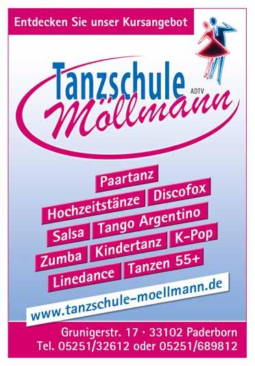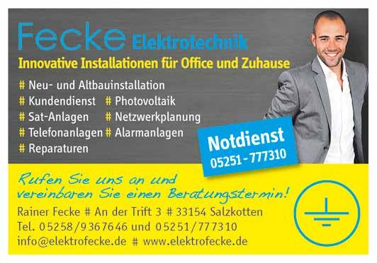 J. Frase GmbH – Der Biohaus-Baumarkt, Driburger Straße 24b (Alte Brotfabrik Ostermann, im Hinterhof), 33100 Paderborn, Tel. 05251/142536, info@jfrase.de Die Ergänzende unabhängige Teilhabeberatung (EUTB®) im Kreis Paderborn berät Menschen mit Be hinderung, chronisch Kranke und deren Angehörige zu allen Fragen rund um die Themen Teilhabe und Rehabi litation. Kontakt: Der Paritätische NRW – Kreisgruppe Paderborn, www.teilhabeberatung-paderborn.de, Tel. 05251/8729611, E-Mail: teilhabeberatung-paderborn@ paritaet-nrw.org Selbsthilfe-Kontaktstelle Paderborn. Sie suchen Menschen, mit denen Sie sich themenbezogen im geschützten Rahmen austauschen können? Wir als Selbsthilfe-Kontaktstelle beraten Sie und vermitteln in bestehende Selbsthilfegruppen oder helfen Ihnen eine neue aufzubauen, wenn es zu Ihrem Anliegen noch kei ne Gruppe gibt. Rufen Sie uns an. Tel. 05251/8782960. Infos unter www.selbsthilfe-paderborn.de Kontaktbüro Pflegeselbsthilfe Paderborn. Sind Sie selbst in einer Pflegesituation und möchten sich gerne mit anderen austauschen? Wir helfen Ihnen gerne Kontakt zu anderen Angehörigen zu bekommen und beraten Sie, wo Sie welche Hilfe bekommen können. Melden Sie sich gerne unter Tel. 05251/3902201 oder per Mail: pflegeselbsthilfe-paderborn@paritaet-nrw.org (gew.) Erfahrener Handwerker für Haus und Garten. Restaurationsarbeiten rund um Ihr Haus/ Wohnung/Garten: Instandsetzungsarbeiten, Dach, Sanitär, Leichtbau wände, Malern & Streichen, Fliesen, Fußbodentechnik, Terrassenreinigung, Garten. Jörg Althaus, Tel. 0151/46649344, E-Mail: major7765@ gmail.com
