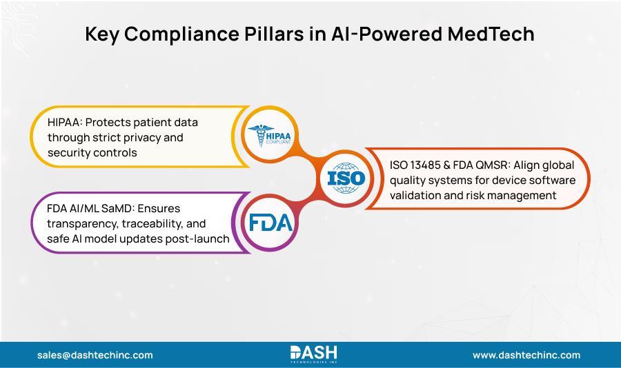 FDA's guidance on AI in Software as a Medical Device emphasizes key priorities. Transparency: regulators need to see your development process. Traceability: decisions and data must be documented. Validation testing should match risk levels. Risk management extends past approval through the full product lifecycle. The Predetermined Change Control Plan (PCCP) stands out it lets you update AI systems that learn continuously after launch while maintaining HIPAA AI compliance and meeting AI regulatory compliance in MedTech standards.