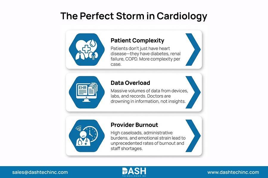 Improving cardiology outcomes is now vital as healthcare moves to value-based models. However, the traditional approach creates a risky paradox. Cardiology teams are seeing more complex patients and more quality metrics, while also working at full capacity, amplifying clinical burden in healthcare at every step of cardiology care delivery.