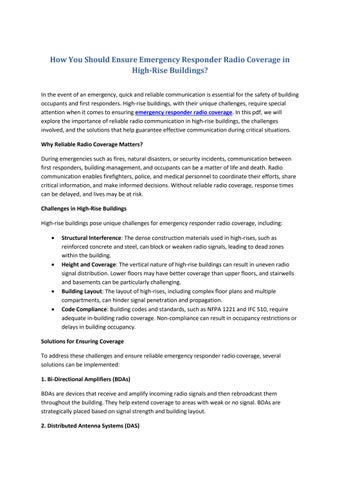 Emergency responder radio coverage ensures reliable communication for first responders during emergencies. This system enhances signal strength within buildings and underground areas, providing uninterrupted communication in critical situations. By improving radio coverage, it enables efficient coordination and response, ensuring the safety of both responders and the public. It’s essential for compliance with safety regulations and effective emergency management.