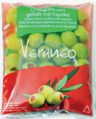 VERANEO ZÖLD OLÍVABOGYÓ magozott 70 g 3557 Ft/kg, paprikával töltött 80 g 3113 Ft/kg