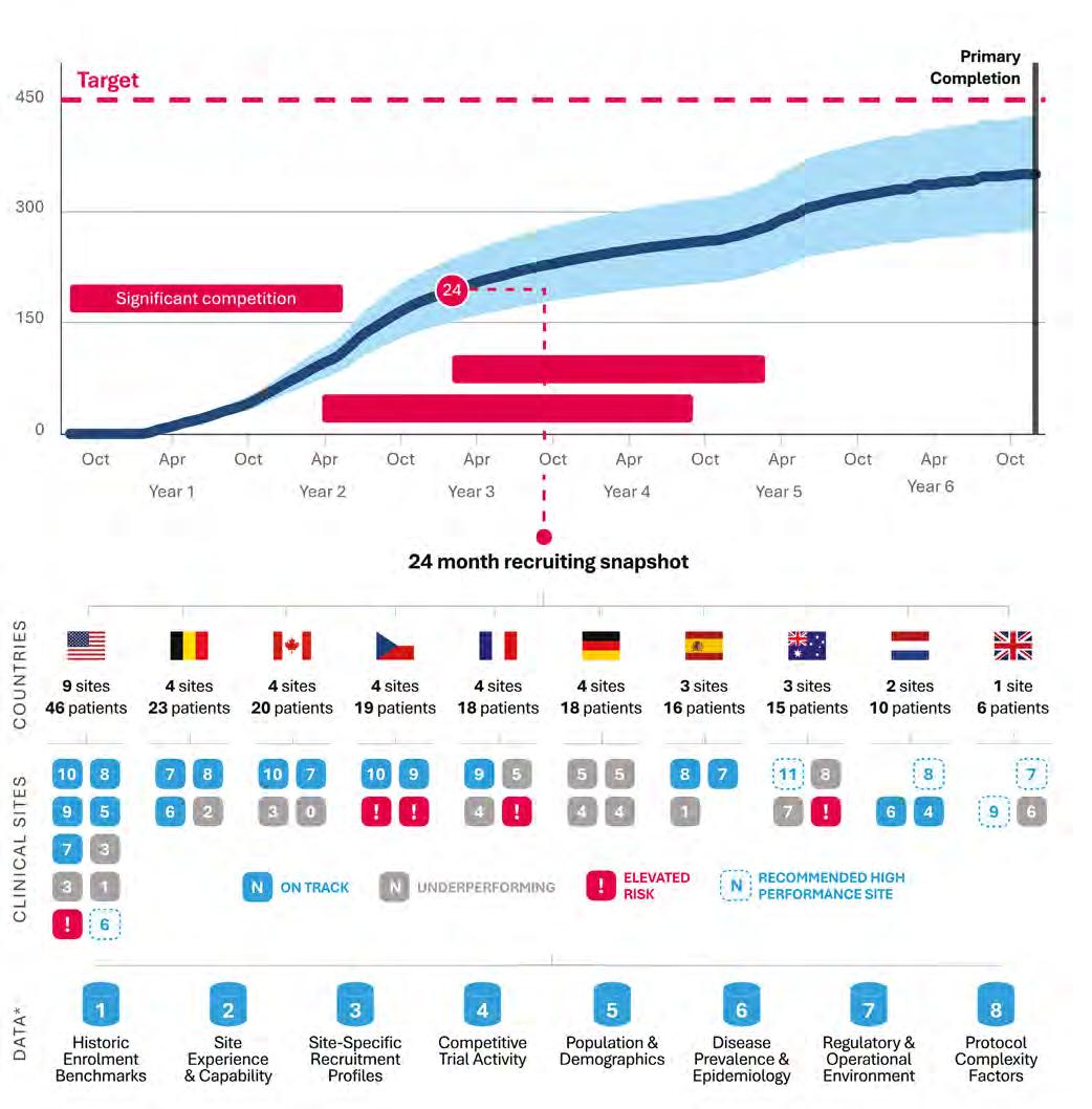 The result is a site-level recruitment forecast that not only estimates expected enrolment at each site, but also flags geographic or operational risks – such as overlapping trials in the same indication or regulatory zone. These insights can be used not only to validate the current site plan, but also to recommend highpotential sites not yet part of the study. Sponsors can optimise their site portfolio for both efficiency and geographic reach – with a clear, data-backed view of how each region contributes to overall enrolment targets.