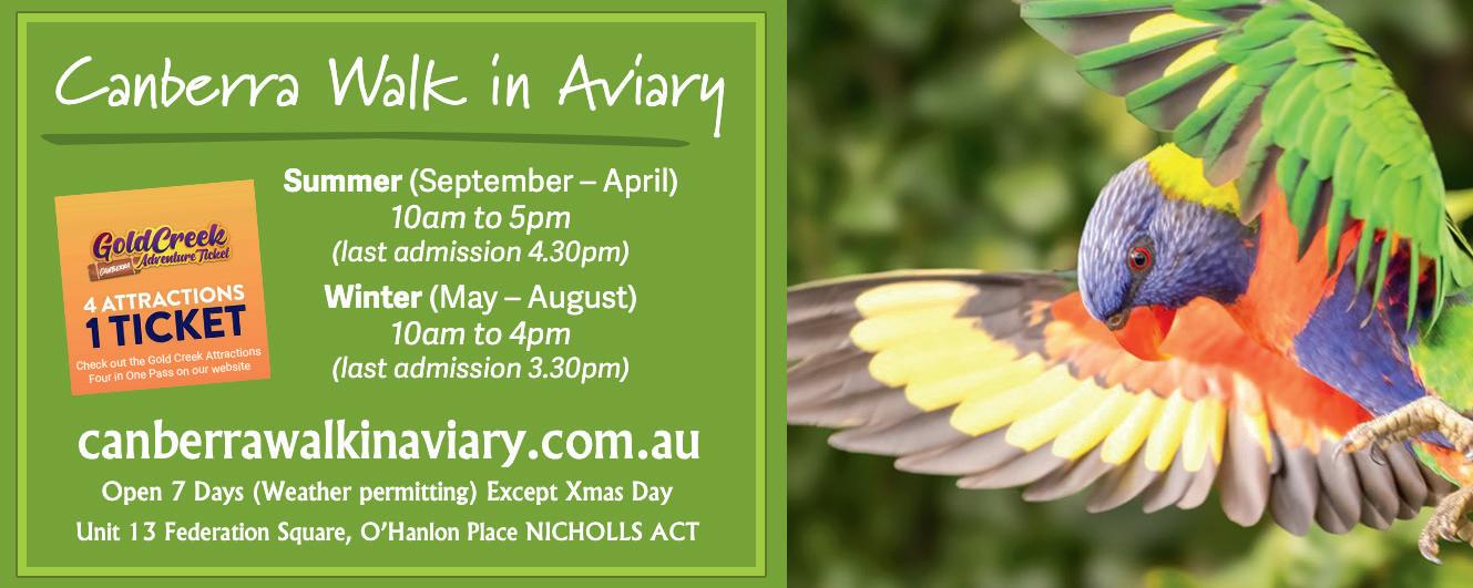 Boasts an extensive collection of up to 500 birds of over sixty species, from on the ground to the unusual and colourful birds above. As one of Gold Creek’s primary attractions, the Canberra Walk In Aviary is open every day except Christmas Day, weather permitting.