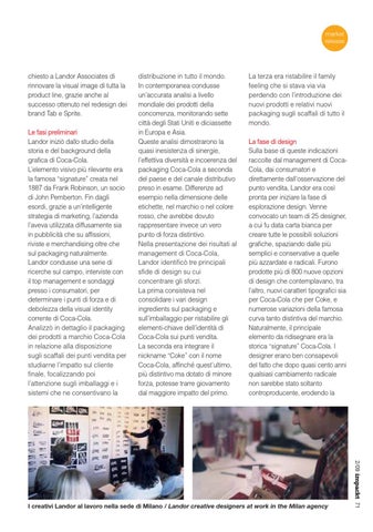distribuzione in tutto il mondo. In contemporanea condusse un’accurata analisi a livello mondiale dei prodotti della concorrenza, monitorando sette città degli Stati Uniti e diciassette in Europa e Asia. Queste analisi dimostrarono la quasi inesistenza di sinergie, l’effettiva diversità e incoerenza del packaging Coca-Cola a seconda del paese e del canale distributivo preso in esame. Differenze ad esempio nella dimensione delle etichette, nel marchio o nel colore rosso, che avrebbe dovuto rappresentare invece un vero punto di forza distintivo. Nella presentazione dei risultati al management di Coca-Cola, Landor identificò tre principali sfide di design su cui concentrare gli sforzi. La prima consisteva nel consolidare i vari design ingredients sul packaging e sull’imballaggio per ristabilire gli elementi-chiave dell’identità di Coca-Cola sui punti vendita. La seconda era integrare il nickname “Coke” con il nome Coca-Cola, affinché quest’ultimo, più distintivo ma dotato di minore forza, potesse trarre giovamento dal maggiore impatto del primo.