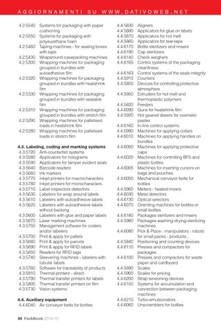 4.2.5540 Systems for packaging with paper cushioning 4.2.5550 Systems for packaging with polyeurethane foam 4.2.5460 Taping machines - for sealing boxes with tape 4.2.5430 Wraparound casepacking machines 4.2.5300 Wrapping machines for packaging grouped in bundles with autoadhesive film 4.2.5320 Wrapping machines for packaging grouped in bundles with heatshrink film 4.2.5330 Wrapping machines for packaging grouped in bundles with sealable film 4.2.5310 Wrapping machines for packaging grouped in bundles with stretch film 4.2.5290 Wrapping machines for palletised loads in heatshrink film 4.2.5280 Wrapping machines for palletised loads in stretch film