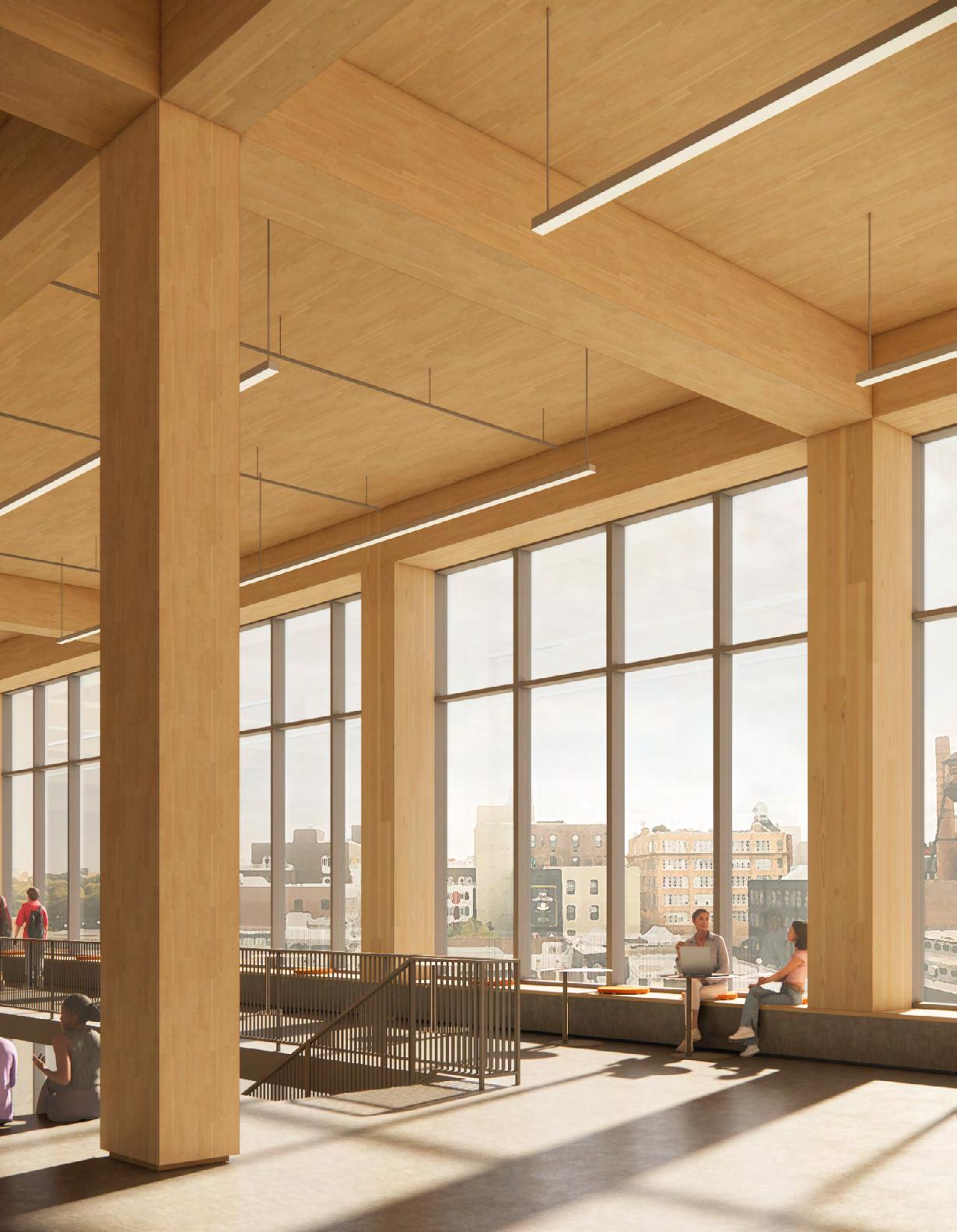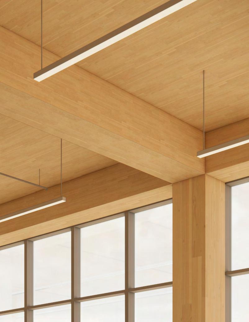 Mass Timber has the unique ability to be both structure and finish material. It can be used to support the implementation of biophilic design principles, boosting well-being and providing connections to nature, along with daylighting, plants, and ample fresh air. The warmth and natural look of exposed wood can have a positive effect on mood and cognitive performance.