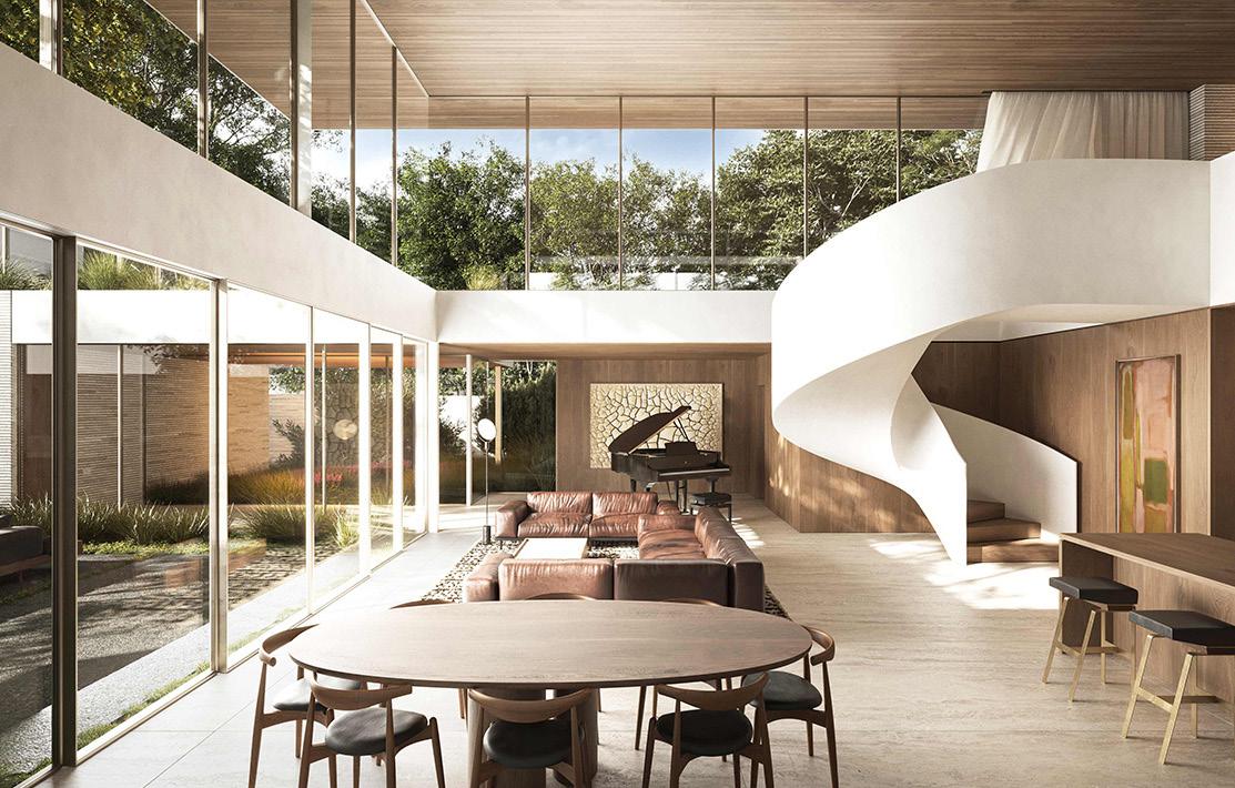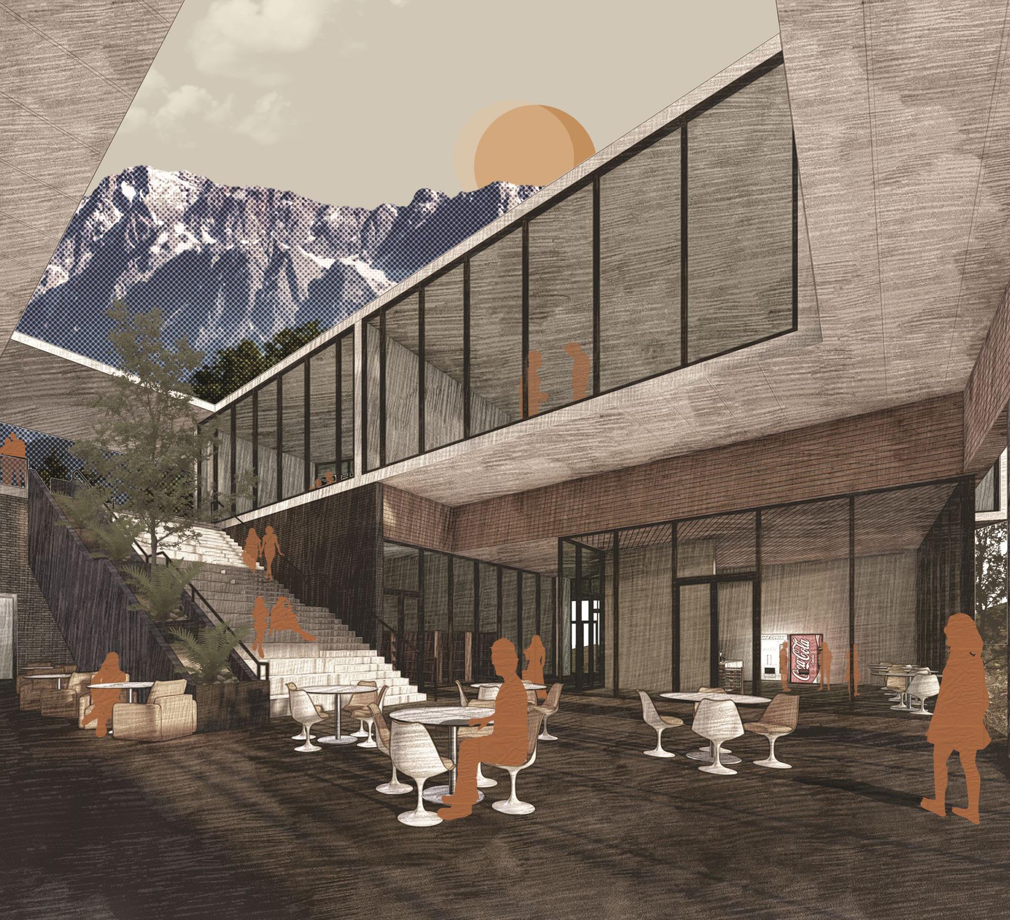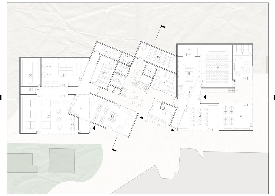Programs are grouped by discipline but intentionally connected at key junctions with layers of transparency, creating spatial moments where boundaries dissolve. These intersections take the form of double-height communal spaces, one central courtyard and two flanking atriums, that act as social condensers, drawing students together for conversation, collaboration, and cross-pollination of ideas.