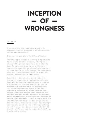 I had never been told I was wrong. Wrong, as in completely incorrect on account of effort, perception, opinion, even methodology. Enter my first year within the College of Design. The CORE program introduces beginning design students to the several divisions of design, allowing one to discover which program incorporates their interests best. For many, that discovery was architecture. However, the competition to gain admittance registered on a new, much larger scale. How was I to engage design given this intensified competition? The answer felt obvious; “the professor is always right.” Competition is the main drive behind students in the year of preparation for application. Professors teach with the hope that students begin to establish a design process. This hope remains, even with the knowledge that true motivation for students often lies in achieving the most popular design. That comparative atmosphere was evident from the start through conversation amongst peers, one-on-one desk critiques and final reviews. Professors and students formed recommendations acknowledging work produced and offered advice for change. Editing a project based upon what the professor thought was best always felt like the only answer. These reviews produced many meaningful conversations, as well as some of the most confusing. As a first year, I soon became consumed with this idea that if I didn’t carry out the project the “right” way, I would achieve nothing.