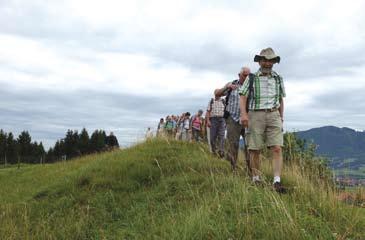 Gruppe A: Über den luftigen Grat zum Hochgratgipfel Vom Imberghaus fahren wir mit dem Wanderbus zur Alpe Hörmoos (1.283 m). Die Wanderung führt auf den Grat der Nagelfluhkette und zu den Falkenköpfen (1.561 m). Weiter auf dem luftigen Grat zum Einegundkopf (1.639 m) und zum Seelekopf (1.663 m). Abstieg zum Staufnerhaus (1.614 m) zur Mittagseinkehr. Am Nachmittag steigen wir auf den Gipfel des Hochgrats (1.834 m) und fahren mit der Seilbahn hinunter zur Lanzenbacher Säge. Länge 8 km, Gehzeit 5.30 Std., Aufstieg 900 Hm, Abstieg 490 Hm.