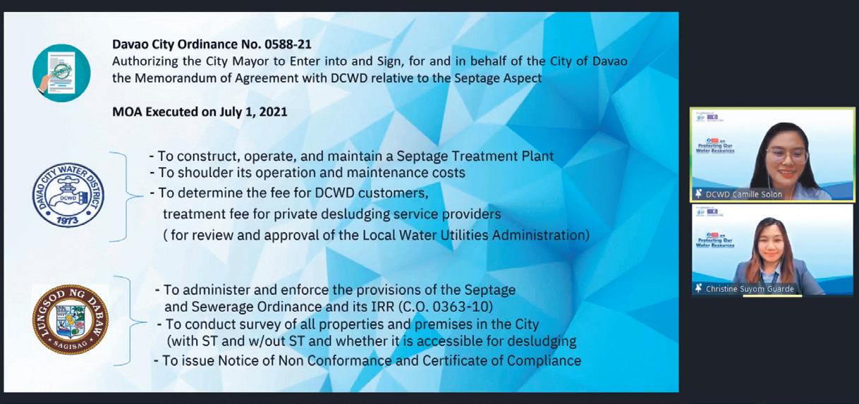 Earlier in May 2021, the City Council enacted City Ordinance No. 0588-21 authorizing the City Mayor to enter into and sign the MOA for the septage aspect of the Septage and Sewerage Management Ordinance. The MOA was signed in July 2021 with the City Government of Davao charged with the duty to administer and enforce the provisions of the Septage and Sewerage Management Ordinance and its IRR and DCWD to construct, operate, and maintain SpTps.
