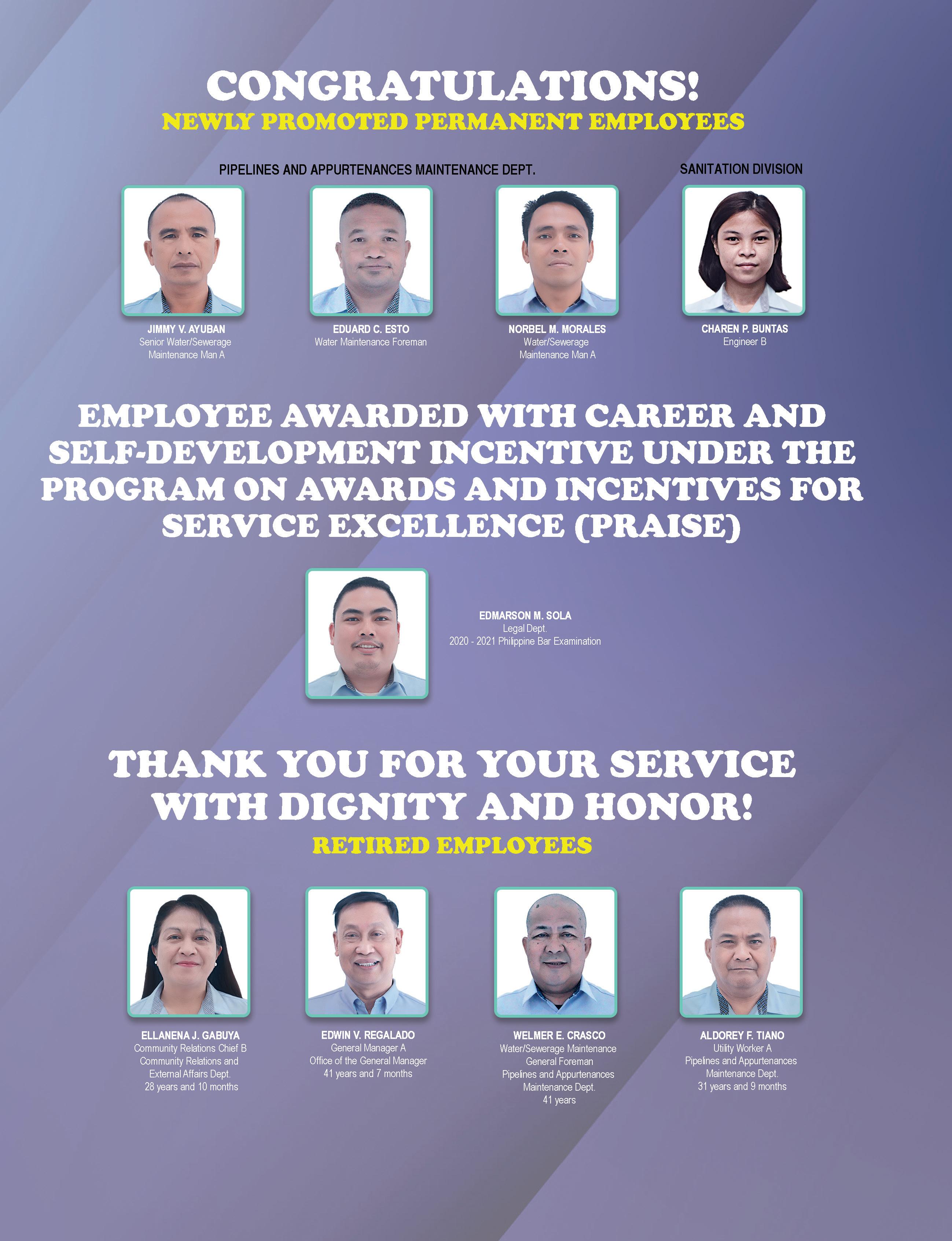 Our 2021 performance had been rewarding considering the challenges we had to hurdle, but DCWD is not known to pause to appreciate its laurels, especially that the need to recover and work double time to accomplish our projected targets is very high.