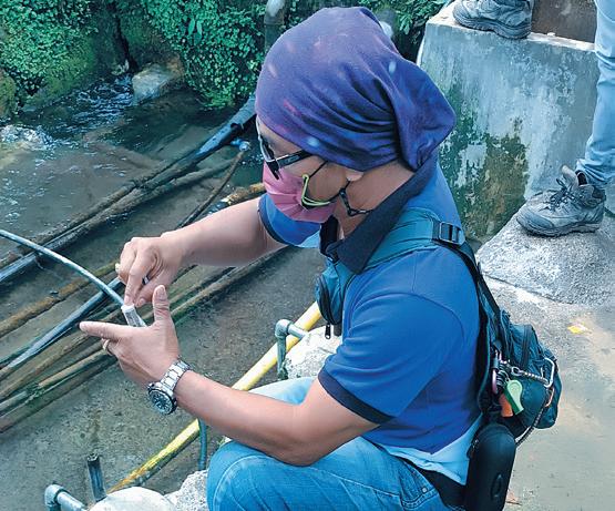 Remollo (left pic) prepares the chlorine residue kit for the chlorine testing demo. Afterward, Bachiller (left-most in right pic) shows the level of chlorine in the water through the result of the chlorine residue test.