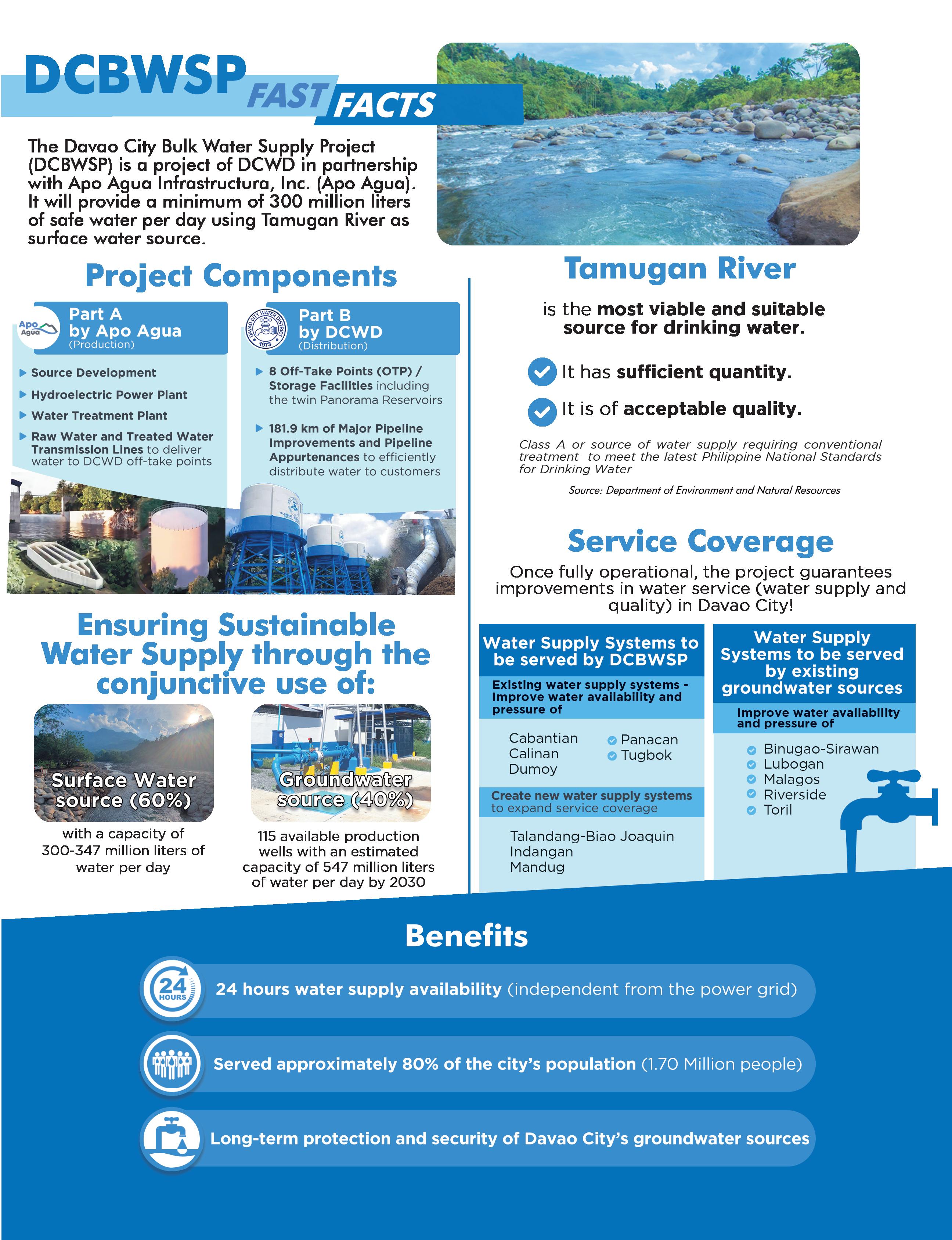 The Davao City Bulk Water Supply Project (DCBWSP) is one of the biggest ventures of DCWD to help improve water service in terms of supply availability and quality and to expand its service coverage in more areas in the city.